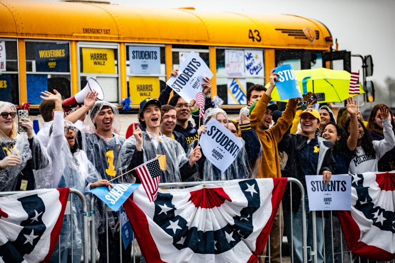 Before wandering in to the Michigan-Minnesota game Saturday, Walz stopped by a rainy tailgate, where supporters sought shelter — and selfies — under a branded Harris-Walz tent.